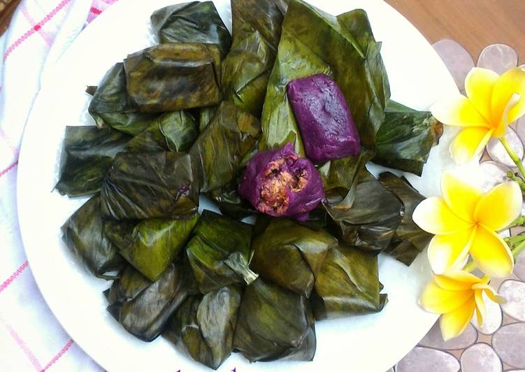 4. Bentuk bulatan adonan pipihkan isi dengan unti lalu bulatkan kembali dan bungkus dengan daun pisang.