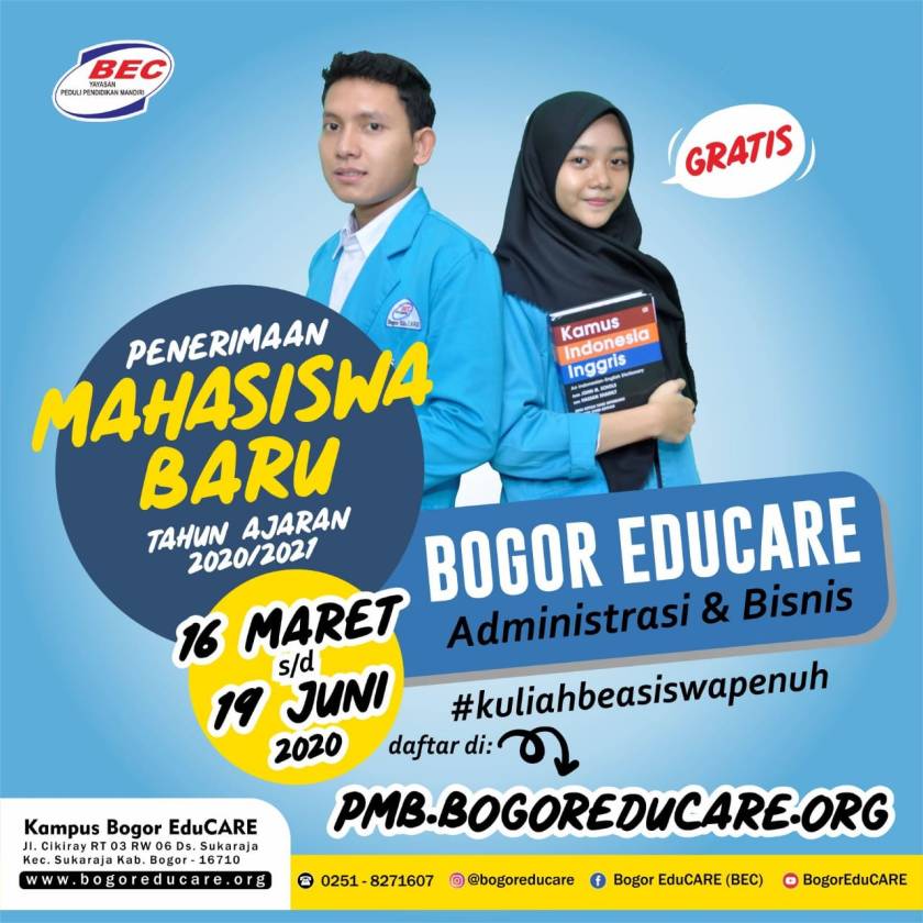 Kabar gembira untuk sobat lulusan SLTA/sederajat yang ingin kuliah tapi terkendala dengan biaya. Kini Bogor EduCARE telah membuka pendaftaran mahasiswa baru angkatan 24 tahun 2020-2021. Bogor EduCARE Didirikan atas dasar kepedulian mengenai kualitas karyawan diberbagai perusahaan yang kurang memiliki kemampuan bahasa Inggris, administrasi dan komputer. Walaupun 100% gratis dari mulai pendaftaran sampai lulus, Bogor EduCARE memiliki berbagai fasilitas yang tak kalah dengan perguruan tinggi lainnya di Indonesia.